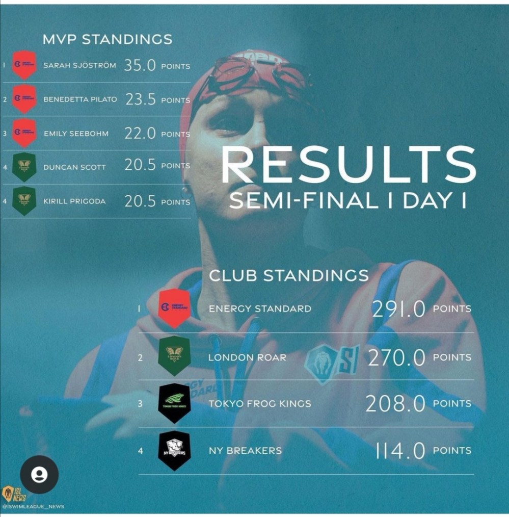 En segundo lugar queda el LONDON ROAR en donde brillaron ADAM PEATY con 54.84 en los 100m braza (en relevo), kira Toussaint con RÉCORD MUNDIAL en 50 espalda (25.60) y el espaldista brasilero Guillerme Guido con 49.40 100m con Récord Sudamericano.
