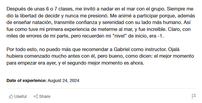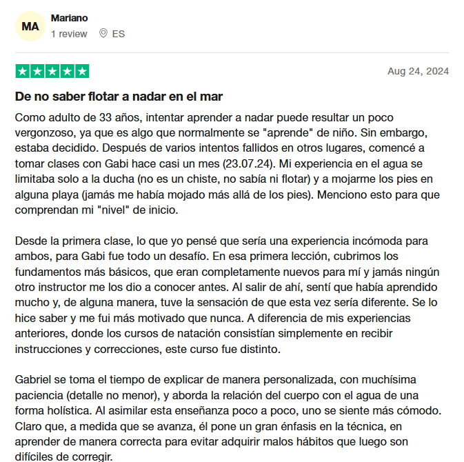Desde el primer día, te sumergirás en un ambiente de aprendizaje enriquecedor, donde cada clase está cuidadosamente diseñada para ayudarte a desarrollar confianza y fluidez en el agua. Si tomás el curso de autor con Gabriel Díaz Fabiero, un profesional de la natación con una metodología innovadora, recibirás un acompañamiento personalizado que asegura avances notables en pocas semanas.